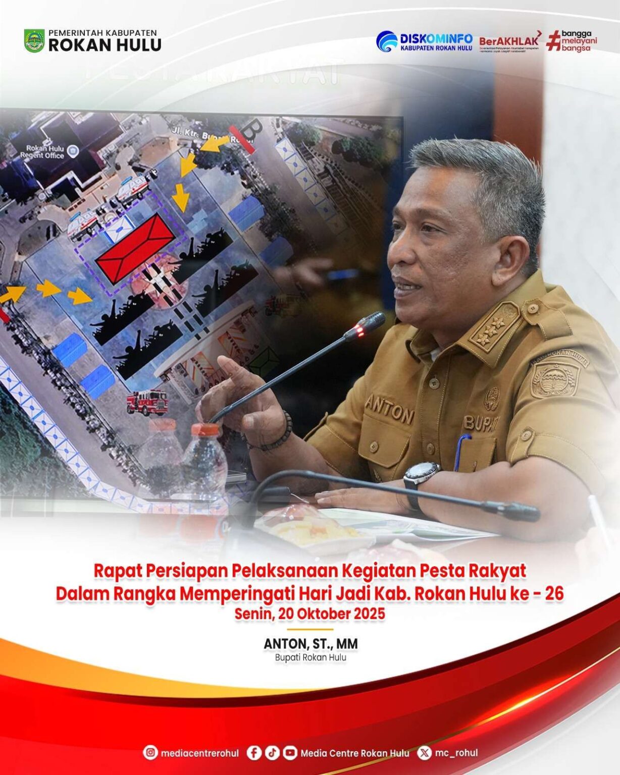 Pasir Pengaraian, (detak indonesia news) – Menjelang pelaksanaan malam puncak pesta rakyat dalam rangka Hari Jadi Kabupaten Rokan Hulu (Rohul) ke-26 tahun yang berlangsung pada tanggal 25 nanti, Bupati Rohul Anton memimpin rapat finalisasi persiapan di Ruang rapat Rumah Dinas Bupati, Senin (20/10/2025).