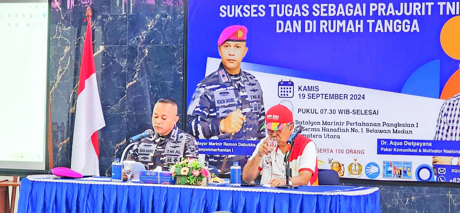 Detakindonesianews.com, TNI AL Belawan,- Komandan Batalyon Marinir Pertahanan Pangkalan (Danyonmarhanlan) I Mayor Marinir Remon Dabukke, M.Tr.Opsla., didampingi Ketua Ranting B Ny. Silvia Remon Dabukke beserta Prajurit Yonmarhanlan I dan Anggota Jalasenastri Ranting B Cabang I Korcab Pasmar 1 menerima sharing komunikasi dan motivasi oleh Motivator Nasional Dr. Aqua Dwipayana, M.I.Kom., bertempat di Balai Prajurit Yonmarhanlan I, Jalan Serma Hanafiah Belawan, Sumatera Utara, Kamis (19/9/2024).