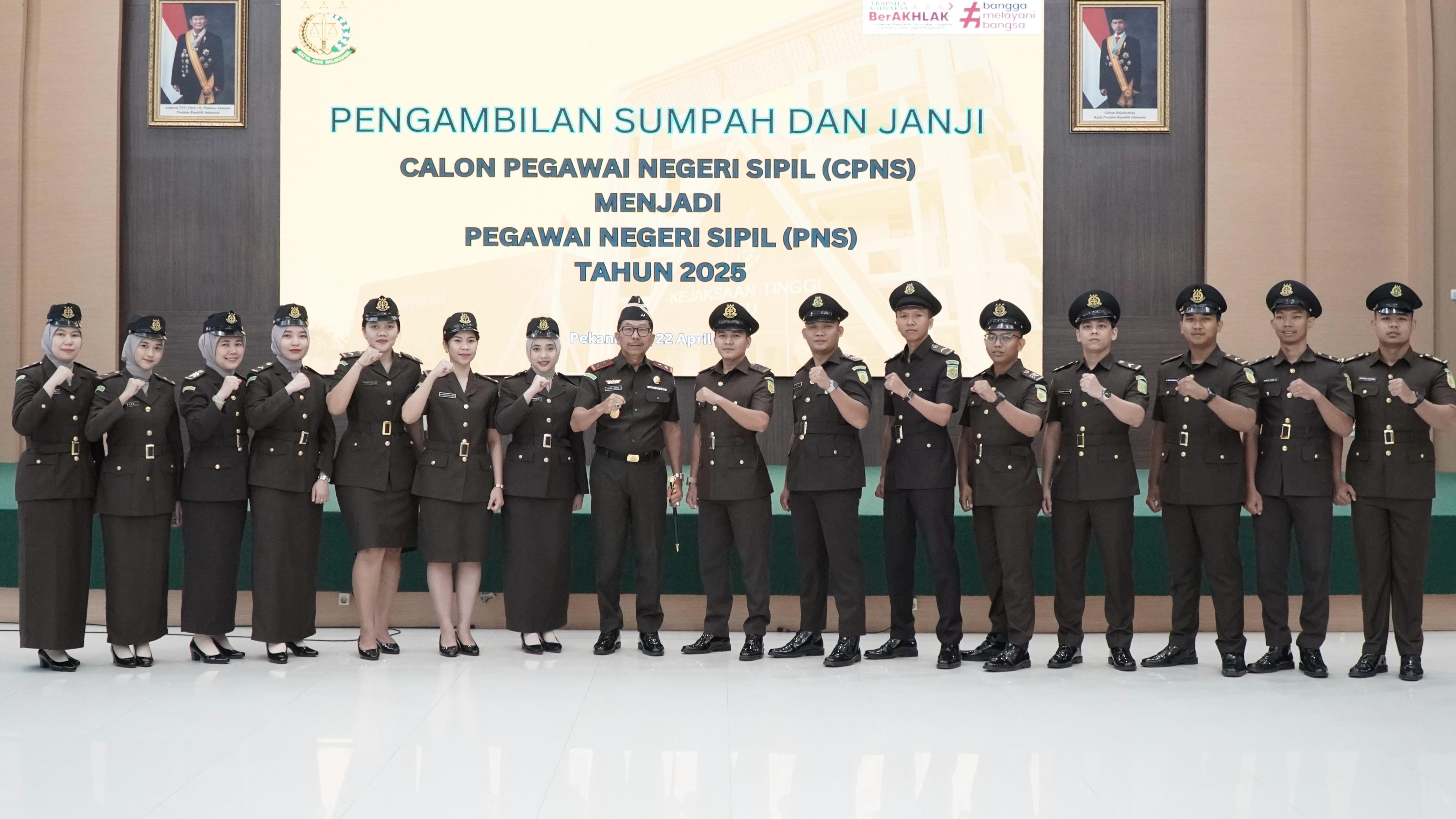 Pekanbaru, Detakindonesianews – Kepala Kejaksaan Tinggi Riau Akmal Abbas, S.H., M.H memimpin upacara pelantikan dan pengambilan sumpah Calon Pegawai Negeri Sipil (CPNS) menjadi Pegawai Negeri Sipil (PNS) Kejaksaan Tinggi Riau, Selasa (22/04/2025), bertempat di Sasana H.M Prasetyo, Gedung Satya Adhi Wicaksana Kejaksaan Tinggi Riau.