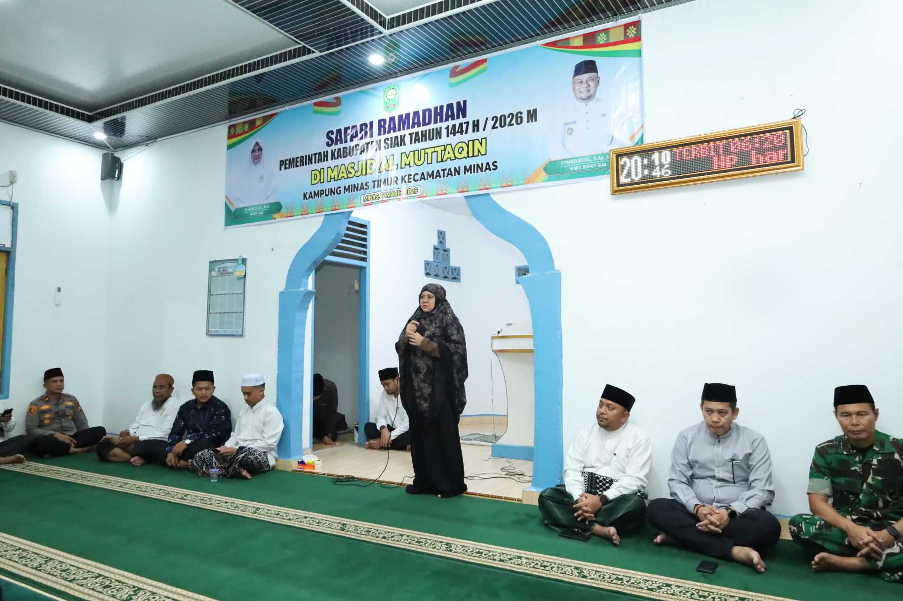 SIAK – Bupati Kabupaten Siak, Afni Z melaksanakan Safari Ramadhan 1447 Hijriah di Masjid Al Muttaqin, Dusun Lukut, Kampung Minas Timur, Kecamatan Minas, Kamis (12/3/2026). Kegiatan ini menjadi momentum silaturahmi antara pemerintah daerah dan masyarakat di bulan suci Ramadhan. Kamis (12/3/2026).