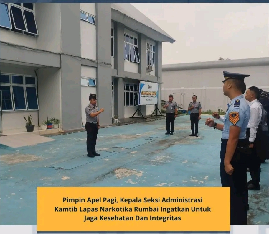 Pegawai Lembaga Pemasyarakatan Narkotika Kelas IIB Rumbai melaksanakan kegiatan apel pagi di lapangan gedung teknis Lapas Narkotika Rumbai yang dipimpin langsung oleh Kepala Seksi Administrasi Keamanan dan Ketertiban, Edoward Nikelini Bangun dan diikuti oleh Pejabat Struktural, Pegawai dan CPNS serta Taruna Lapas Narkotika Rumbai. Senin (28/7/2025).